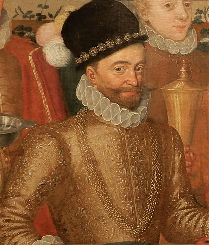 Čeština: Anthoni Beysː Jakub Hannibal I. zHohenemsu, jeho manželka Hortensie Borromeo, se služebníky (střed skupinového portrétu), datováno 1577; Městské muzeum a galerie Polička