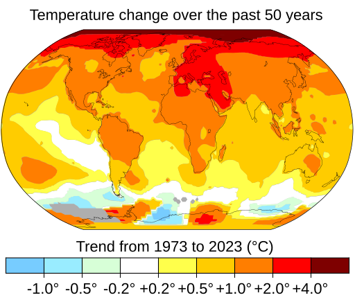 Výrazy globální oteplování, resp. změna klimatu popisují probíhající zvyšování průměrné globální teploty – a jeho dopady na klimatický systém Země. Změna klimatu v širším slova smyslu zahrnuje také předchozí dlouhodobé změny zemského klimatu. Současný nárůst průměrné globální teploty je rychlejší než předchozí změny a je způsoben především spalováním fosilních paliv lidmi. Používání fosilních paliv, odlesňování a některé zemědělské a průmyslové postupy zvyšují množství skleníkových plynů… Wikipedie