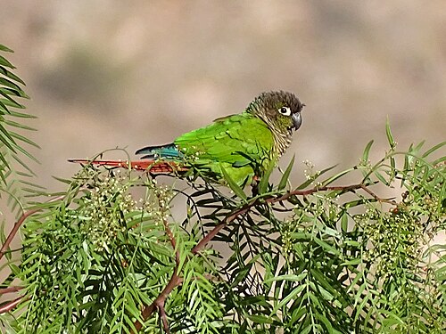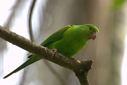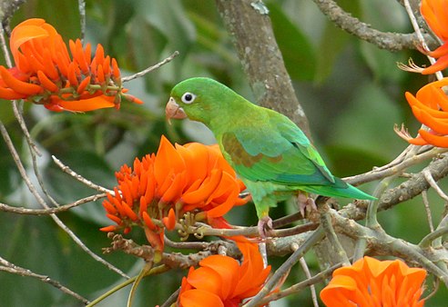 Small, fast-flying parakeet of humid lowlands; restricted to the Pacific slope in the northern parts of its range. Favors forest patches and fairly open country with hedges and tall trees, including towns and villages.